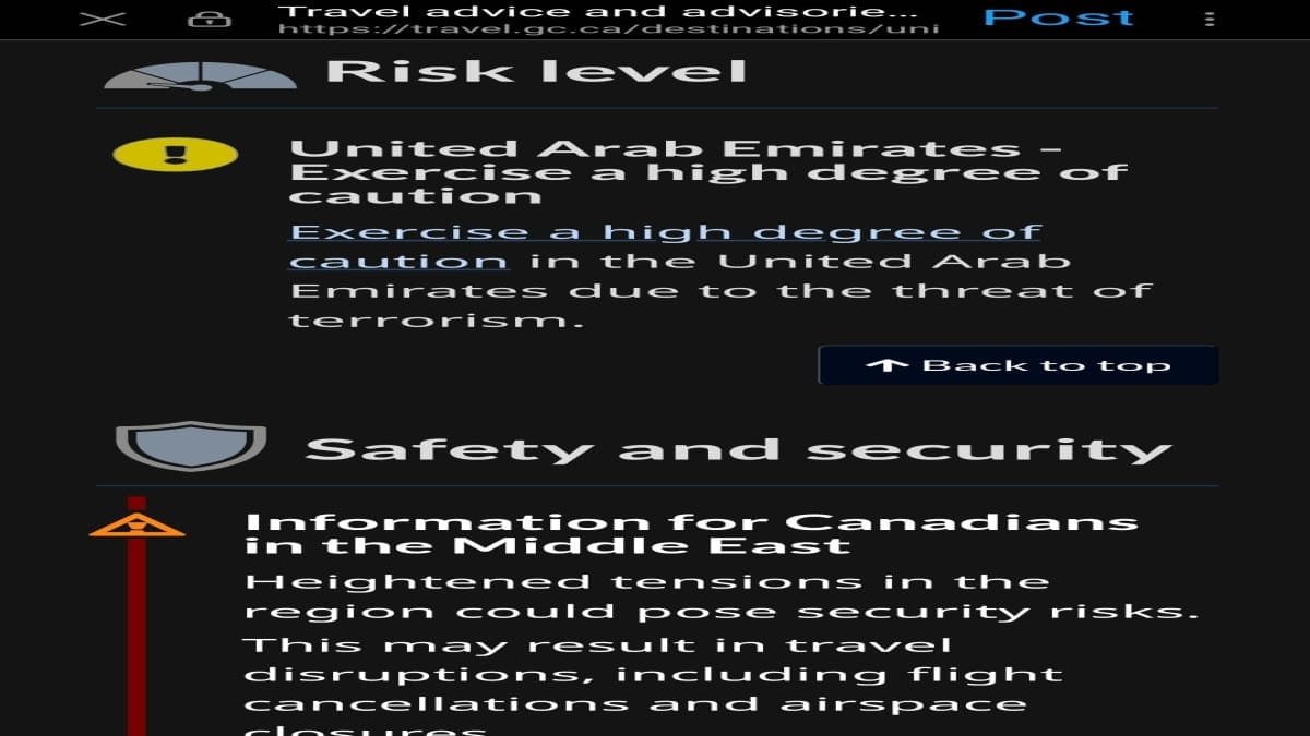 كندا تحذر مواطنيها من السفر إلى دولة الامارات العربية المتحدة وتنوه رعاياها الي توخي الحذر من احتمال وقوع هجمات بدولة الإمارات في الايام القادمة